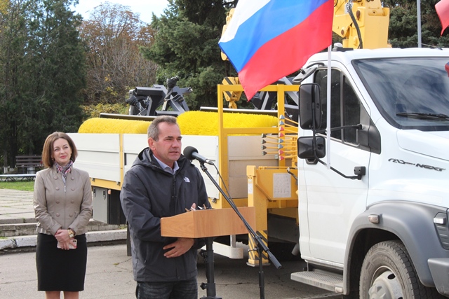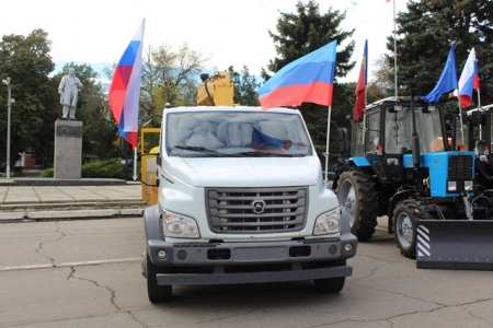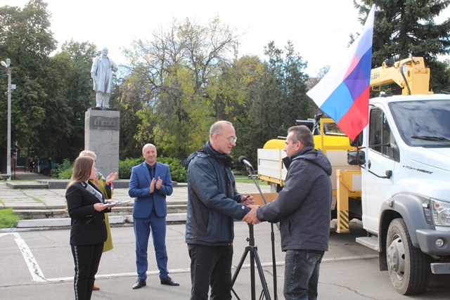 Ключи от техники вручил представитель Алтайского края Юрий Проскурин врио директора МУП «Монолит» Славяносербского района Луганской Народной Республики Владимиру Танчику.