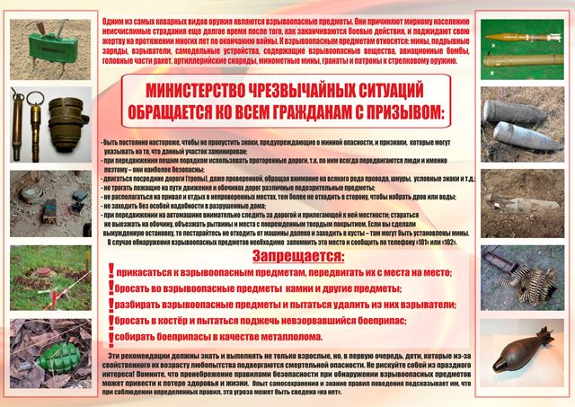 Ни в коем случае нельзя трогать боеприпасы, передвигать их с места на место, разбирать, поджигать, бросать в костёр, собирать в качестве металлолома или сувениров.