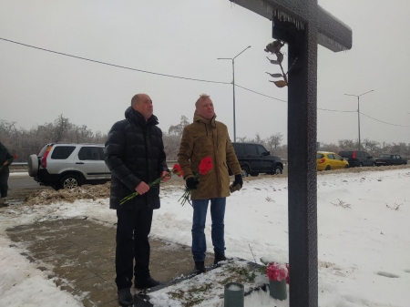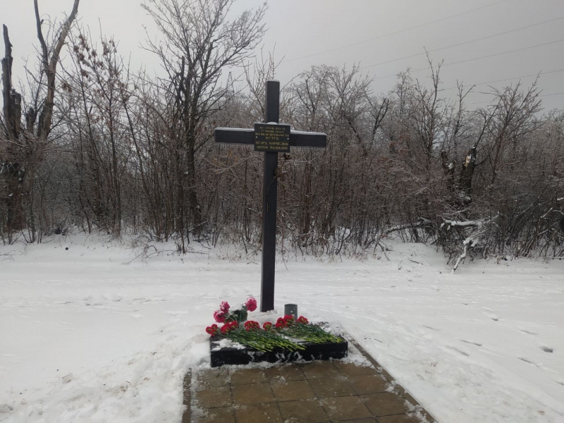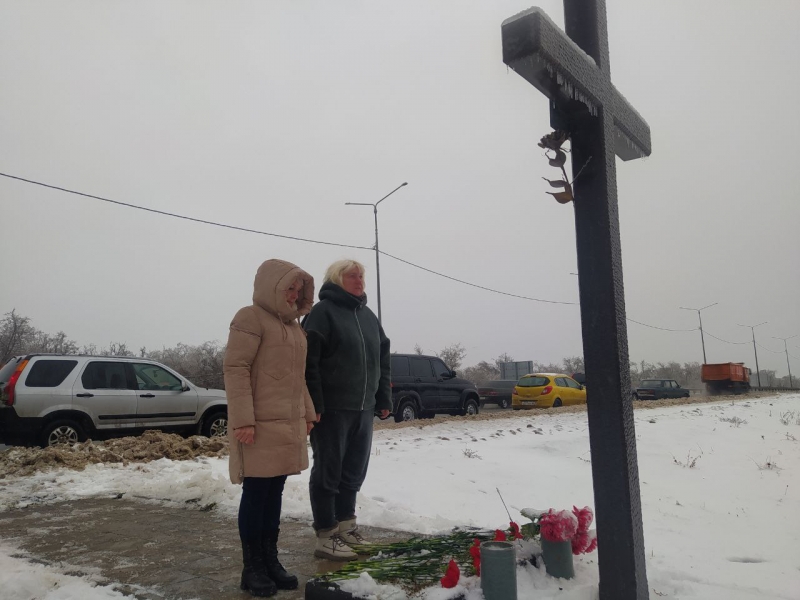 Участники возложили цветы к Поклонному кресту, расположенному на месте гибели журналистов ВГТРК Игоря Корнелюка и Антона Волошина при въезде в поселок Металлист.