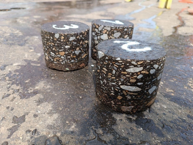 Для определения толщины дорожного полотна и сцепления между слоями произведен отбор кернов асфальтобетонного покрытия.
