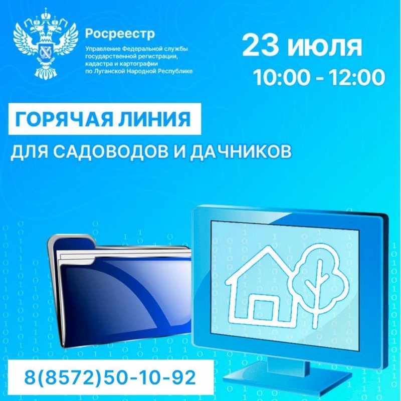 23 июля 2024 года с 10:00 до 12:00 Управление Росреестра по Луганской Народной Республике проведет «горячую телефонную линию» для садоводов и дачников, приуроченную ко Дню дачника.