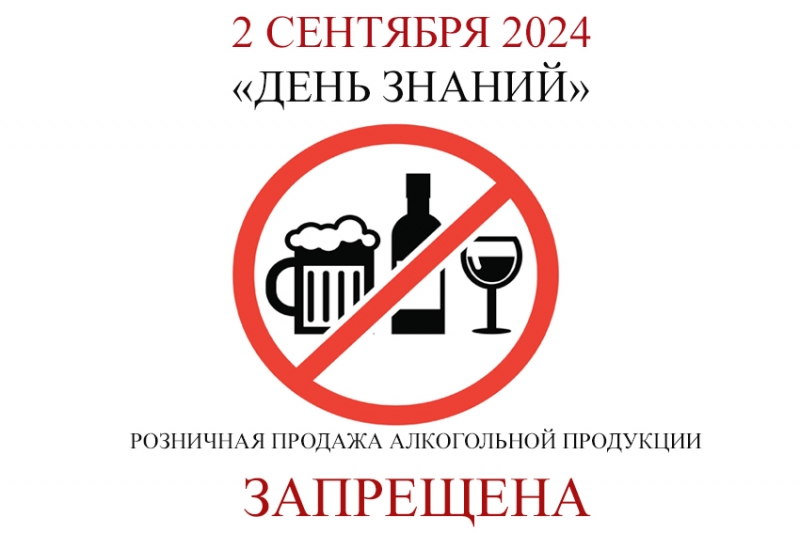Отдел по экономическому развитию администрации муниципального округа муниципальное образование Славяносербский муниципальный округ Луганской Народной Республики информирует субъектов хозяйствования, что согласно Указа Главы Луганской Народной Республики от 26 августа 2024 года № УГ-730/24 «Об установлении запрета на розничную продажу алкогольной продукции на территории Луганской Народной Республики» в соответствии с частью 9 статьи 16 Федерального закона от 22.11.1995 № 171-ФЗ «О государственном регулировании производства и оборота этилового спирта, алкогольной и спиртосодержащей продукции и об ограничении потребления (распития) алкогольной продукции» установлен полный запрет на розничную продажу алкогольной продукции, за исключением розничной продажи алкогольной продукции при оказании услуг общественного питания, в день проведения мероприятий, посвященных Дню знаний - 02.09.2024.