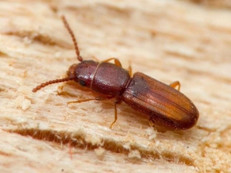 Опасный вредитель, повреждающий зерно и крупы хлебных злаковых культур (пшеницы, ржи, ячменя), а также гречихи, риса, кукурузы, проса и других, за исключением масличных и бобовых. По внешнему виду вредитель похож на хлебного точильщика. Он имеет тонкое удлиненное тело цилиндрической формы с параллельными боками длиной 2,5 – 3 мм и две пары крыльев, цвет может изменяться от красно-коричневого до черно-бурого. Жук хорошо летает, его переднеспинка вытянута и похожа на капюшон, прикрывающий голову и покрытый зубьями спереди и по бокам. Самка откладывает на зерно или другой субстрат до 580 яиц белого цвета и грушевидной формы. При температуре воздуха + 26 – 30 °C эмбриональное развитие длится 5 – 11 суток. Вышедшие из яиц личинки достигают размера 3 мм. Они окрашены в белый цвет, имеют червеобразную форму, маленькую голову и три пары ног, благодаря чему свободно передвигаются. Передние грудные сегменты толще других, задние сегменты изогнуты крючкообразно. Голова желтого цвета втянута в переднегрудь.