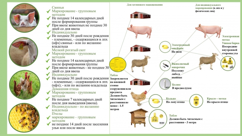 Процедуре маркирования и учёта подлежат крупный рогатый скот, мелкий рогатый скот, свиньи, лошади, домашняя птица, пушные звери, рыбы, пчёлы.