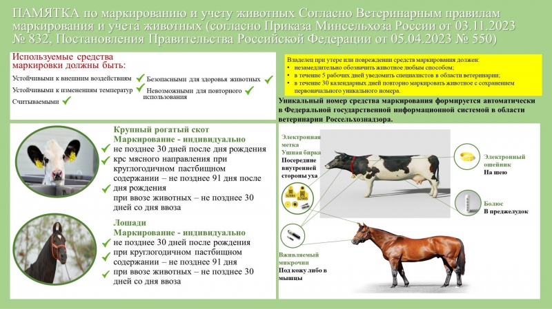 Управление ветеринарии Министерства сельского хозяйства и продовольствия Луганской Народной Республики обращает внимание хозяйствующих субъектов, осуществляющих деятельность по содержанию, разведению сельскохозяйственных животных, включая личные подсобные хозяйства, что в соответствии с Федеральным законом от 28.06.2022 № 221 – ФЗ «О внесении изменений в Закон Российской Федерации «О ветеринарии», маркирование и учёт сельскохозяйственных животных является обязательным.Постановлением Правительства Российской Федерации от 05.04.2023 № 550 «Об утверждении Правил осуществления учета животных и перечня видов животных, подлежащих индивидуальному или групповому маркированию и учету, случаев осуществления индивидуального или группового маркирования и учета животных, а также сроков осуществления учета животных» установлены правила осуществления учёта и предельные сроки учёта и маркирования сельскохозяйственных животных в зависимости от их вида, количества, а также организационно - правовой формы хозяйства.