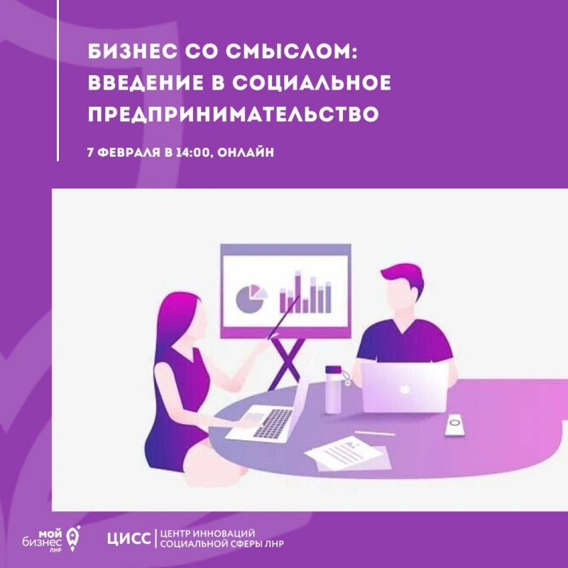 7 февраля в 14:00 Центр инноваций социальной сферы ЛНР проведет онлайн-встречу "Бизнес со смыслом: введение в социальное предпринимательство". Спикером встречи выступит заместитель руководителя центра консультирования и государственной поддержки Агентства развития бизнеса Калужской области Туманова Анна Владимировна.