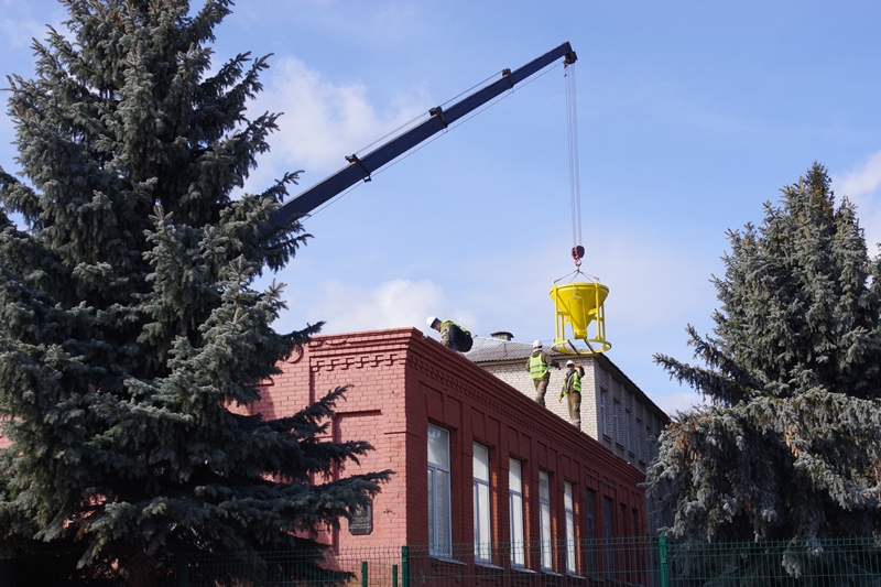 На здании произвели демонтажные работы. Полностью демонтирована крыша и чердачное перекрытие. На данный момент выполняют бетонные работы. Сделано армирование монолитного пояса, производится бетонирование. В последующем планируется монтаж металлических балок и устройство монолитной плиты перекрытия.