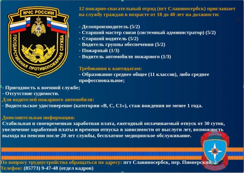 12 пожарно спасательный отряд пгт. Славяносербск приглашает на службу