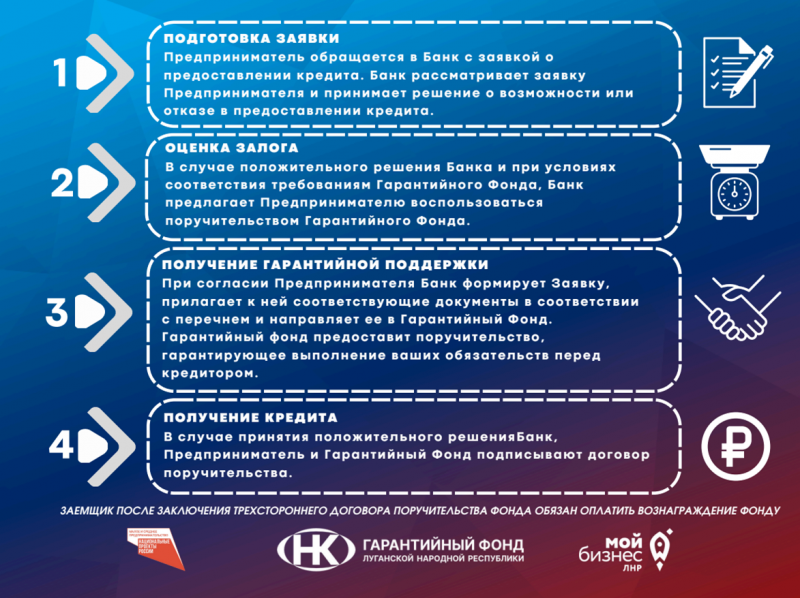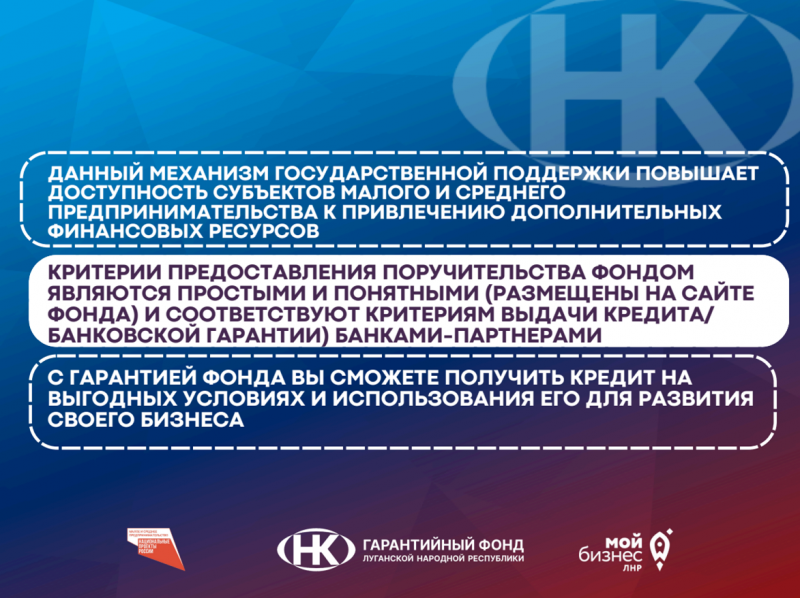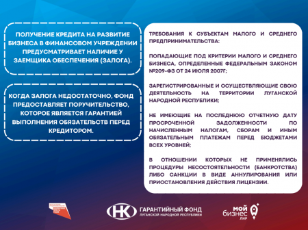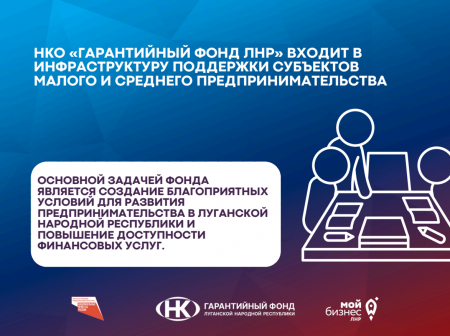 Некоммерческая организация «Гарантийный фонд Луганской Народной Республики» может предоставить субъектам МСП поручительство на сумму до 80 % от размера запрашиваемого заёмного финансирования, а стоимость гарантии составит 0,5 % годовых.