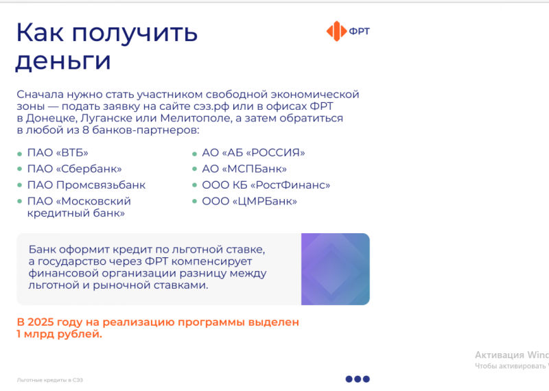 Свободная экономическая зона (СЭЗ) – это территории Донецкой Народной Республики, Луганской Народной Республики, Запорожской и Херсонской областей, где действуют особые льготы для бизнеса. Резиденты СЭЗ могут взять кредит от 1 млн до 5 млрд рублей на срок до 5 лет для реализации инвестиционных проектов или пополнения оборотных средств.