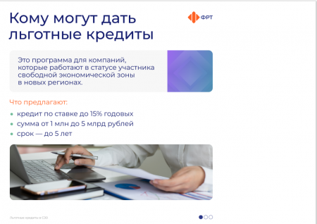 Компаниям – резидентам свободной экономической зоны в новых регионах России доступны льготные кредиты по ставке до 15% годовых.