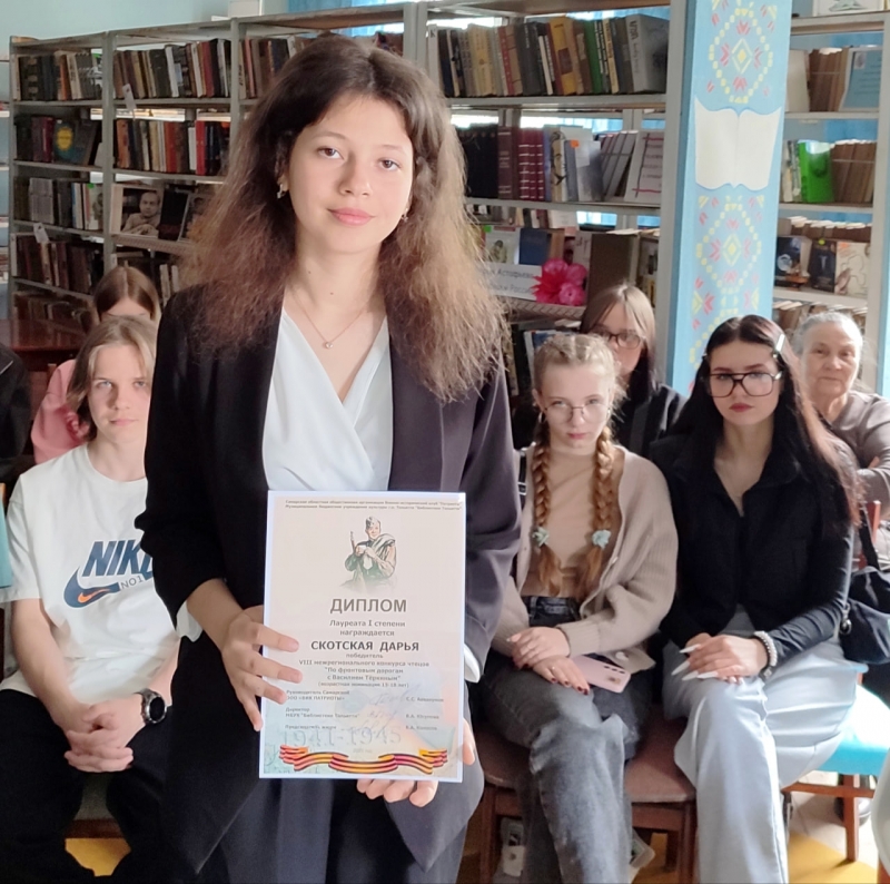 Этому великому произведению Самарская областная библиотека и МБУ г. Тольятти "Библиотеки Тольятти" посвятили конкурс чтецов "По дорогам войны с Василием Тёркиным". Учащиеся школы приняли в нём активное участие, и победа не заставила себя ждать: диплом победителя VIII межрегионального конкурса чтецов был заслуженно вручён учащейся 11 класса, Скотской Дарье. Присутствующие от всей души поздравили юную победительницу.