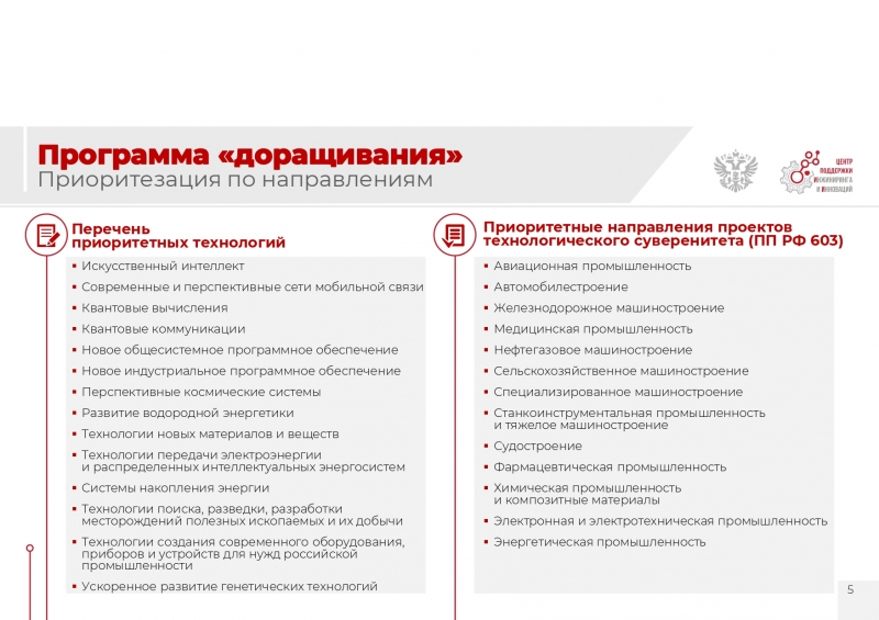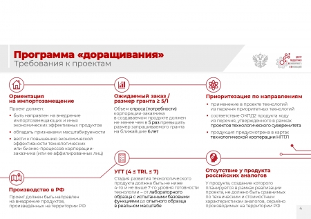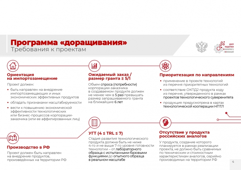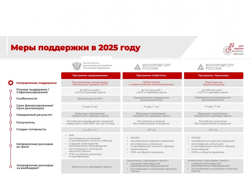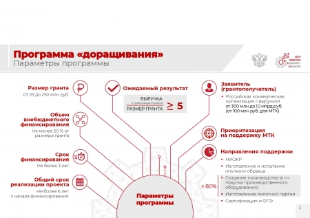 Министерство экономического развития Луганской Народной Республики информирует, что Автономной некоммерческой организацией «Центр поддержки инжиниринга и инноваций» реализуется грантовая программа, направленная на поддержку отечественных поставщиков крупных российских корпораций (далее — программа «доращивания»).Программа «доращивания» предполагает грантовую поддержку проектов российских технологических компаний по разработке и созданию (расширению) производства импортозамещающей и иной инновационной продукции под конкретные задачи (технические требования) российских корпораций. Максимальный размер гранта составляет 250 млн рублей. Финансирование на доработку продукта осуществляется в течение 3 лет, после окончания финансирования через 3 года грантополучателю необходимо обеспечить коммерциализацию разработки, в пять раз превысив размер полученных бюджетных средств.