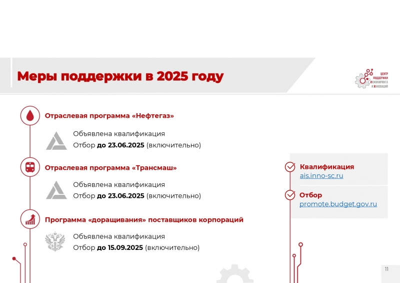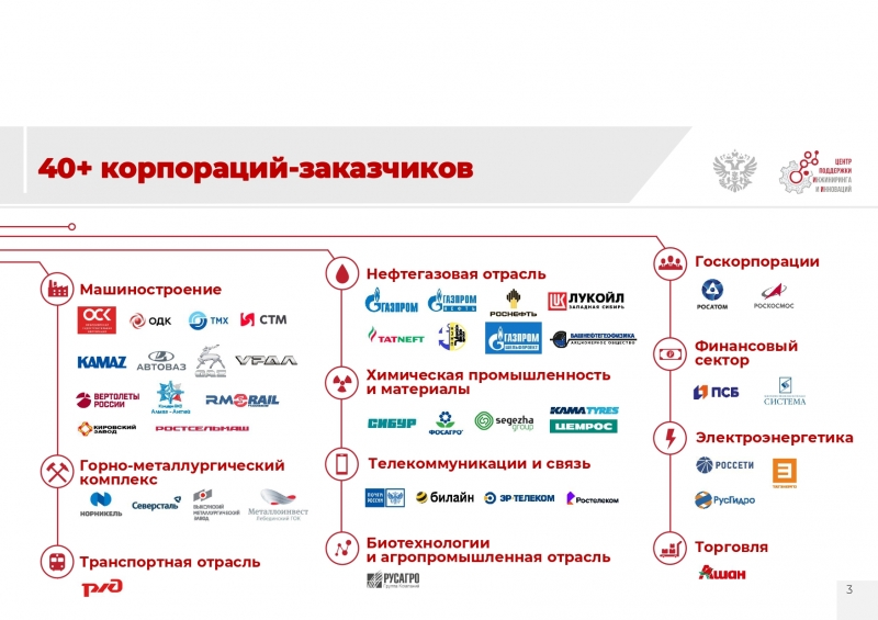 Для участия в отборе технологическим компаниям требуется: 1. Пройти квалификацию компании в целях оценки соответствия компетенций в автоматизированной информационной системе Центра (ais.inno-sc.ru/); 2. Иметь подтвержденную потребность корпорации-заказчика в создаваемом продукте (при содействии Центра).