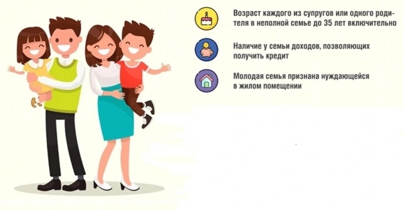 - Возраст каждого из супругов либо одного родителя в неполной семье на день включения в список претендентов на выплату не превышает 35 лет