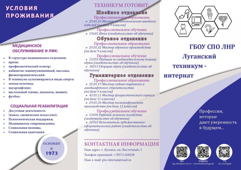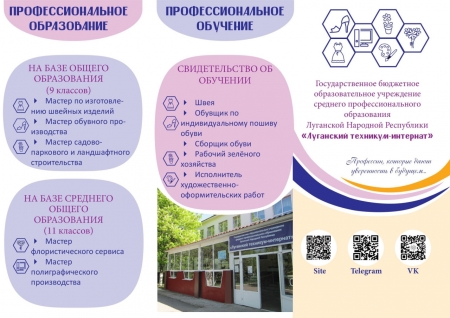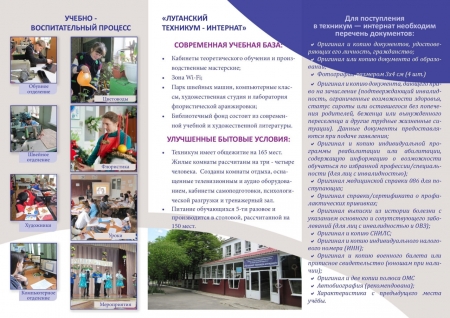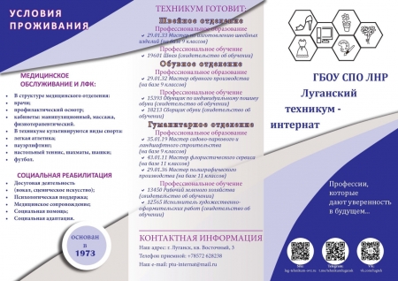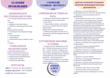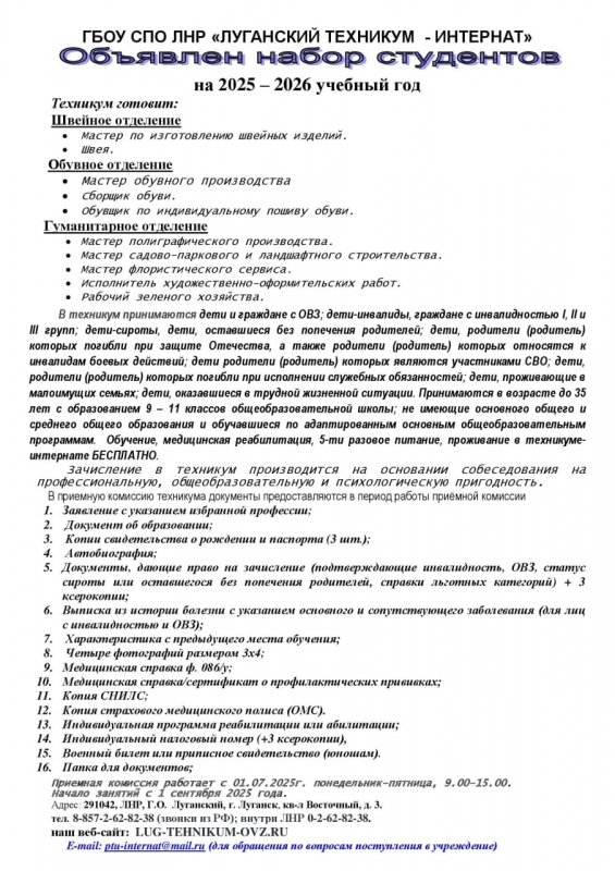 В техникум принимаются дети и граждане с ОВЗ; дети-инвалиды, граждане с инвалидностью I, II и III групп; дети-сироты, дети, оставшиеся без попечения родителей; дети, родители (родитель) которых погибли при защите Отечества, а также родители (родитель) которых относятся к инвалидам боевых действий; дети родители (родитель) которых являются участниками СВО; дети, родители (родитель) которых погибли при исполнении служебных обязанностей; дети, проживающие в малоимущих семьях; дети, оказавшиеся в трудной жизненной ситуации. Принимаются в возрасте до 35 лет с образованием 9 – 11 классов общеобразовательной школы; не имеющие основного общего и среднего общего образования и обучавшиеся по адаптированным основным общеобразовательным программам. Обучение, медицинская реабилитация, 5-ти разовое питание, проживание в техникуме-интернате БЕСПЛАТНО.