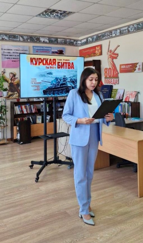 21 августа в МБУ «Славяносербская централизованная библиотека» состоялся историко-патриотический час «Сквозь дым и пламя Курской битвы», посвященный Дню воинской славы России — Дню разгрома советскими войсками немецко-фашистских войск в Курской битве.