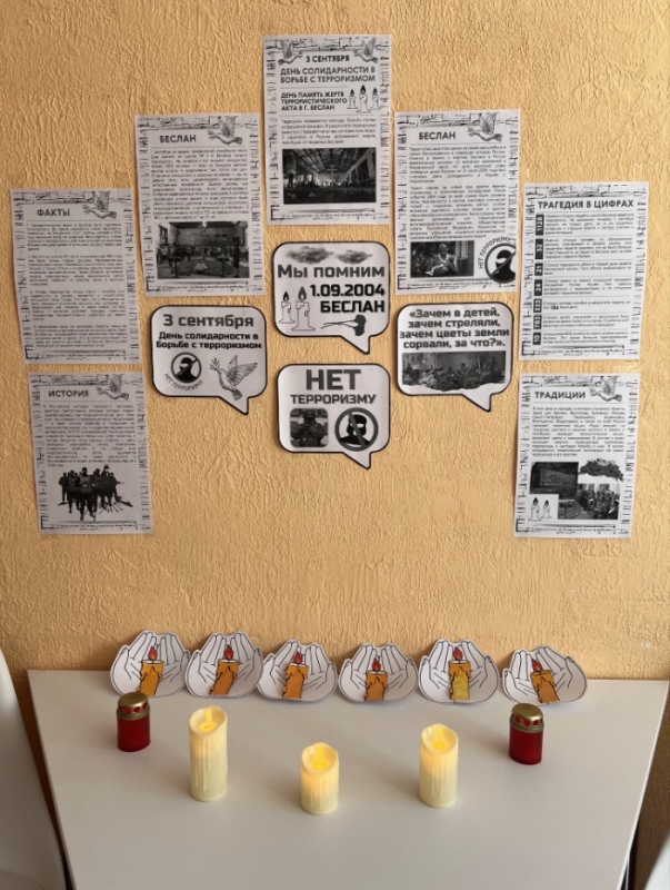 Ежегодно 3 сентября отмечается День солидарности в борьбе с терроризмом – о скорбной памяти о трагических днях Беслана, 1-3 сентября 2004 года. Тогда, в результате бесчеловечного по своей жестокости террористического акта, оборвались более 300 жизней, среди которых – безвинные жизни женщин и детей. Эта дата, закрепленная Федеральным законом № 130-ФЗ «О днях воинской славы и памятных датах России» от 6 июля 2005 года. Беслан, город, опаленный горем, навсегда изменил свой календарь, и День знаний здесь начинается только после трагической даты 3 сентября.
