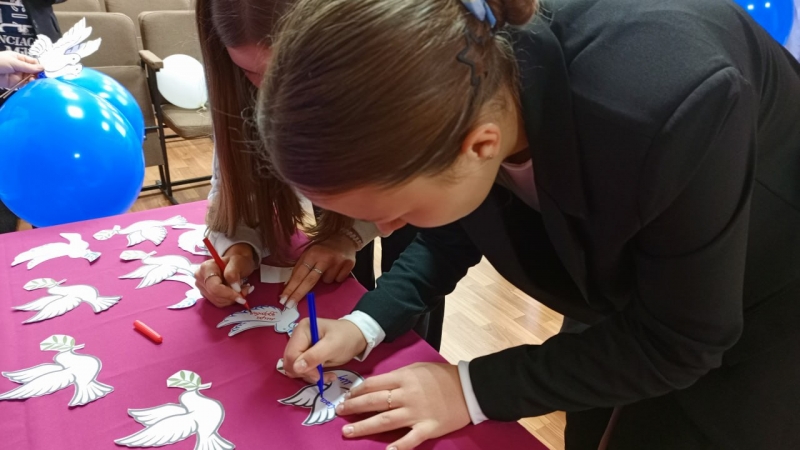На парящих на синем холсте белых голубях ребята оставили свои теплые пожелания всем жителям планеты.