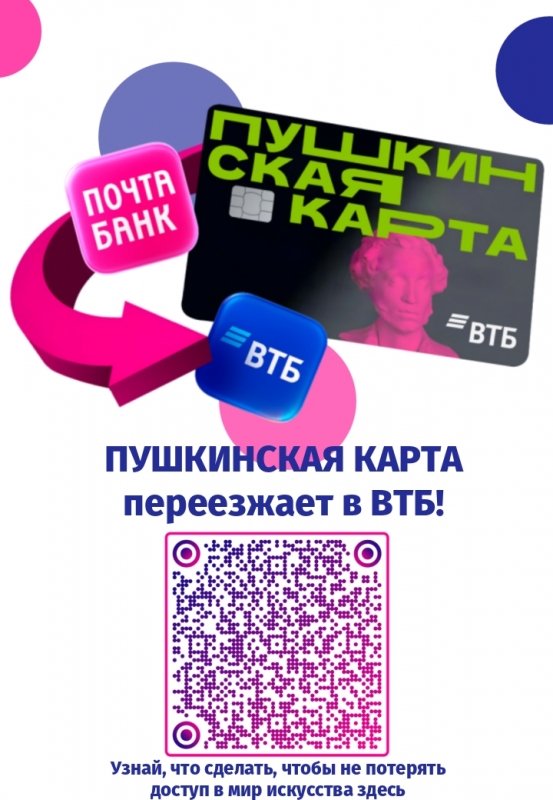 ?Информируем, что с 1 января 2026 г. роль оператора Программы перейдет от АО «Почта Банк» к Банку ВТБ (ПАО), в связи с чем «Пушкинскую карту» необходимо перевыпустить в Банке ВТБ (ПАО).