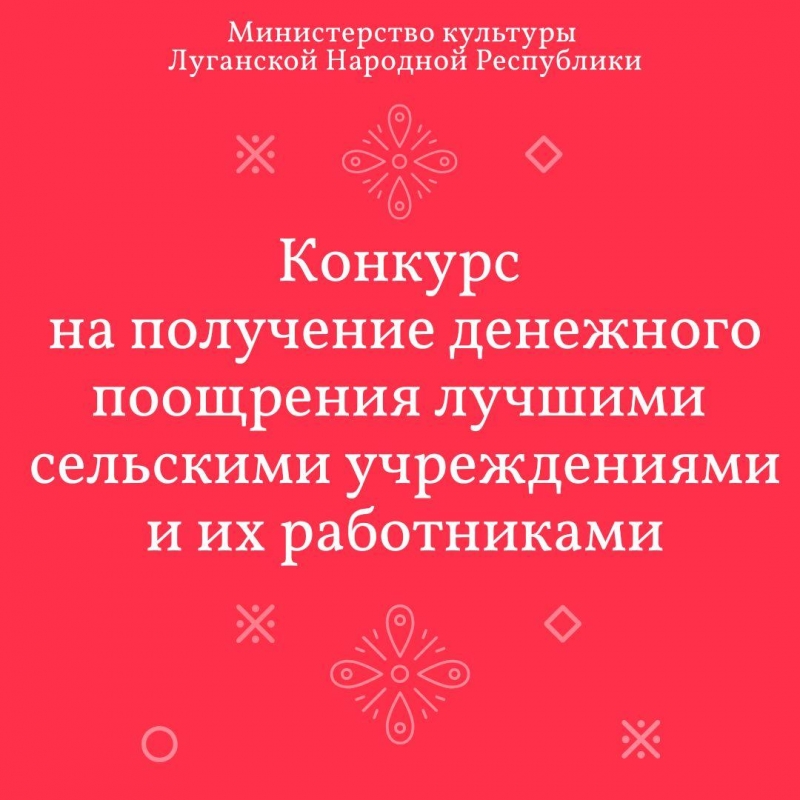 Министерство культуры ЛНР объявляет конкурс для сельских учреждений культуры и их работников на получение денежного поощрения в 2026 году.Этот конкурс — важный инструмент поддержки тех, кто сохраняет и развивает наши традиции и духовное наследие в сельских районах. Дополнительное финансирование позволит обновить материально-техническую базу и повысить мотивацию работников, благодаря чему культура в наших сёлах и посёлках будет уверенно продолжать развиваться.