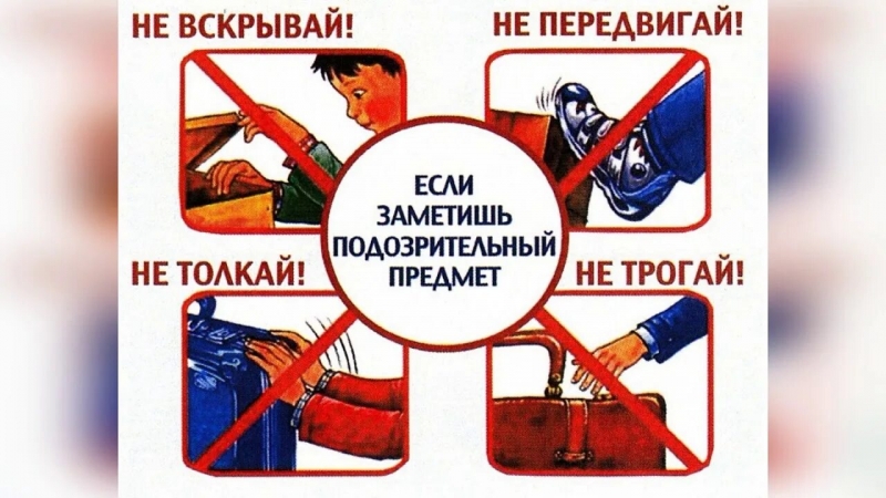 Ни в коем случае не трогайте, не поднимайте, не передвигайте, не вскрывайте, не бутсайте подозрительный предмет! Любые действия с ним могут привести к взрыву или другим опасным последствиям.