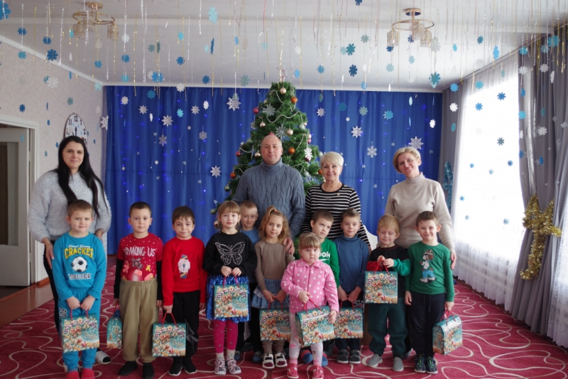 Первым делом глава отправился в ясли-сад «Малыш». Вместе с Председателем совета Антониной Гречишкиной передали детям новогодние подарки — сладкие наборы.
